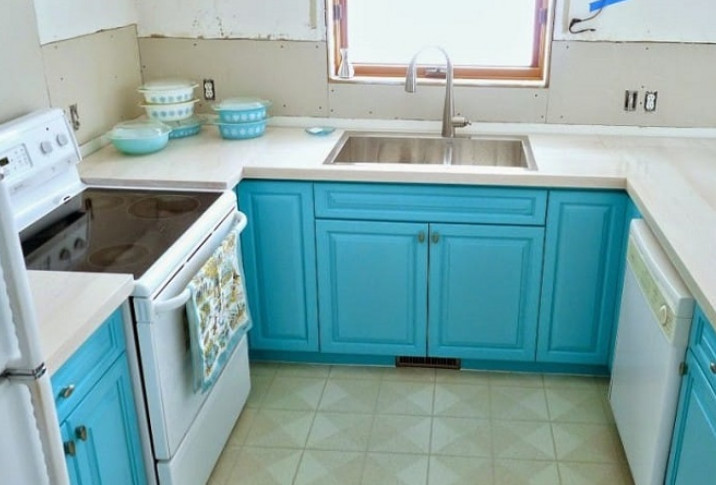 Изменения коснулись также и нижних шкафчиков, девушка перекрасила их в нежный бирюзовый оттенок. Стены Татьяна обшила гипсокартоном, а также обзавелась глубокой раковиной и практичной столешницей.